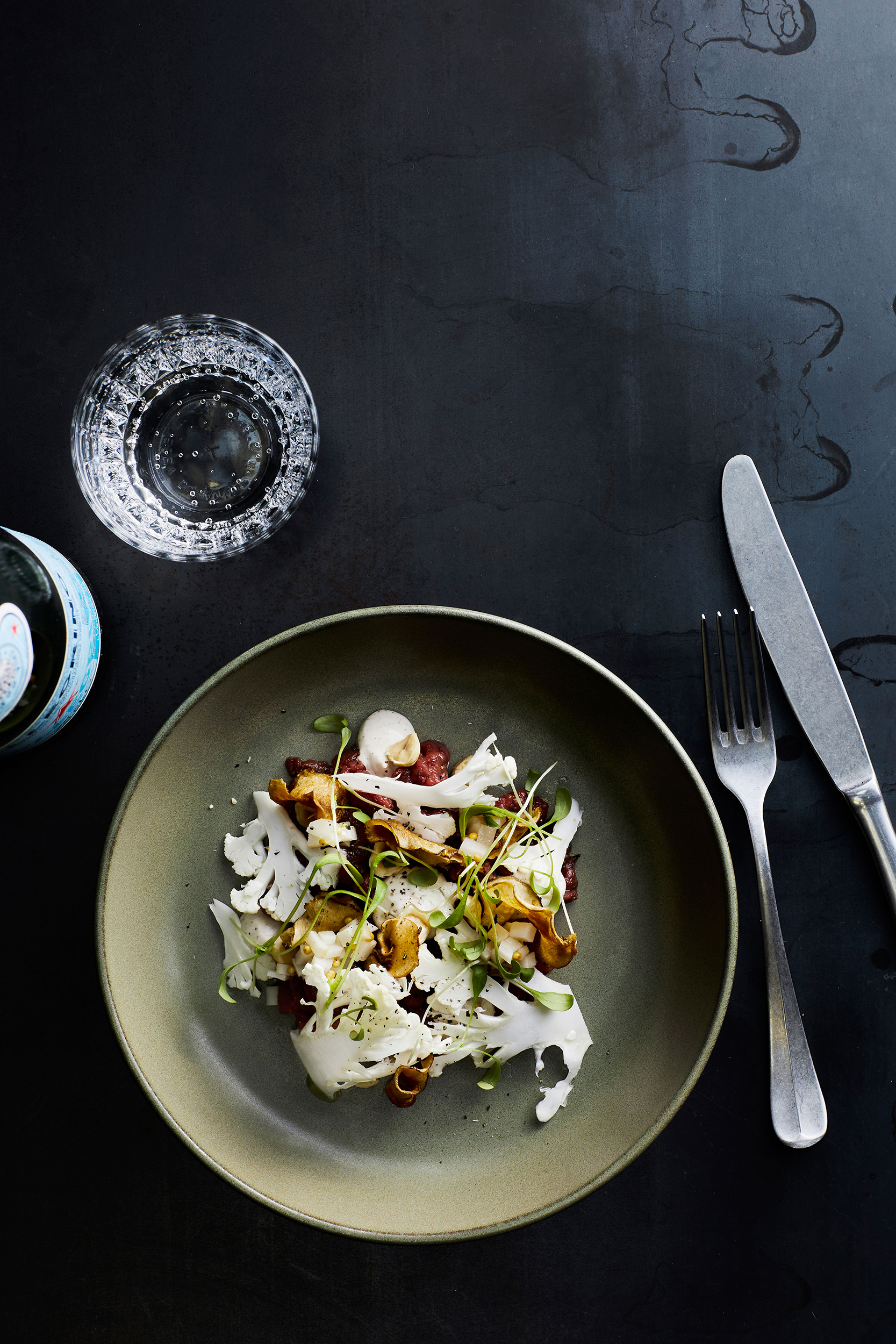 Beef tartare, roasted tomatoes, potatoe chips, frisée, Vesterhavs cheese